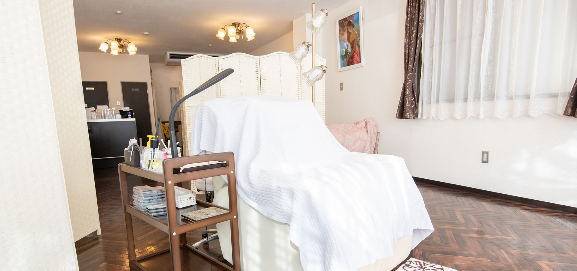 白を基調とした店内は、大人の女性を思わせる落ち着いたラグジュアリーな空間となっております。待合室はシックな雰囲気のインテリアでそろえ、贅沢な気分を盛り上げます。施術を行う空間ではリクライニングシートをご用意しており、ひとり当たりの施術スペースを広くとっておりますので、ゆったりとリラックスして施術を受けていただけます。